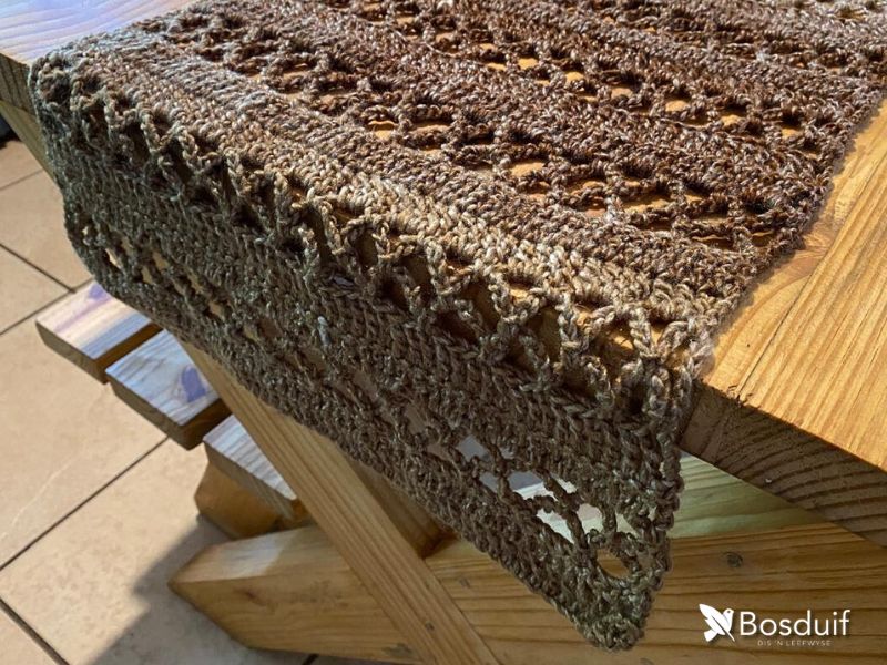 Soos die voël self, bring hierdie tafelloper ’n warm bosveldgevoel na die hart van jou huis. Dis gemaak vir tafels waar daar stadig geëet word, waar stories bly hang, en waar handgemaakte dinge waarde kry met tyd.